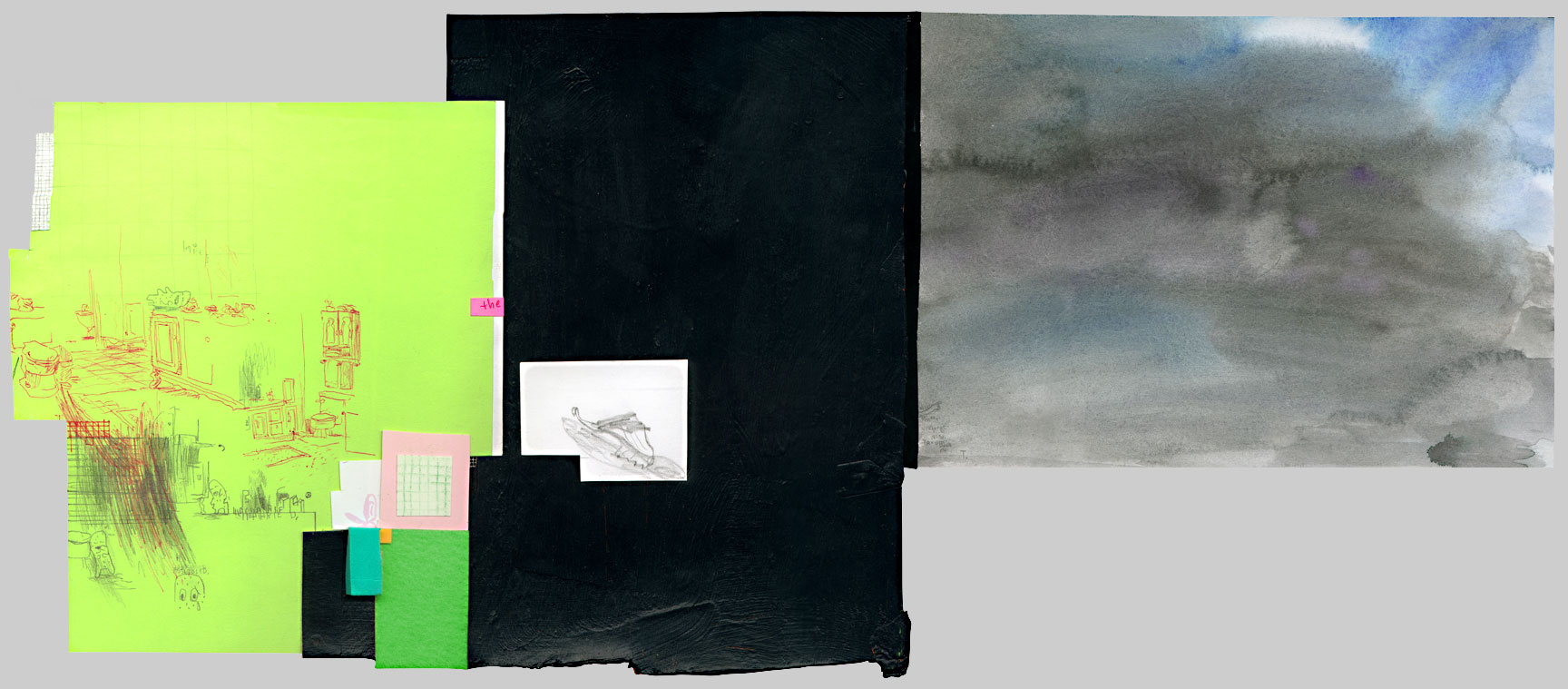 pen, pencil, acrylic, felt, bubblejet print, watercolor and foam on paper